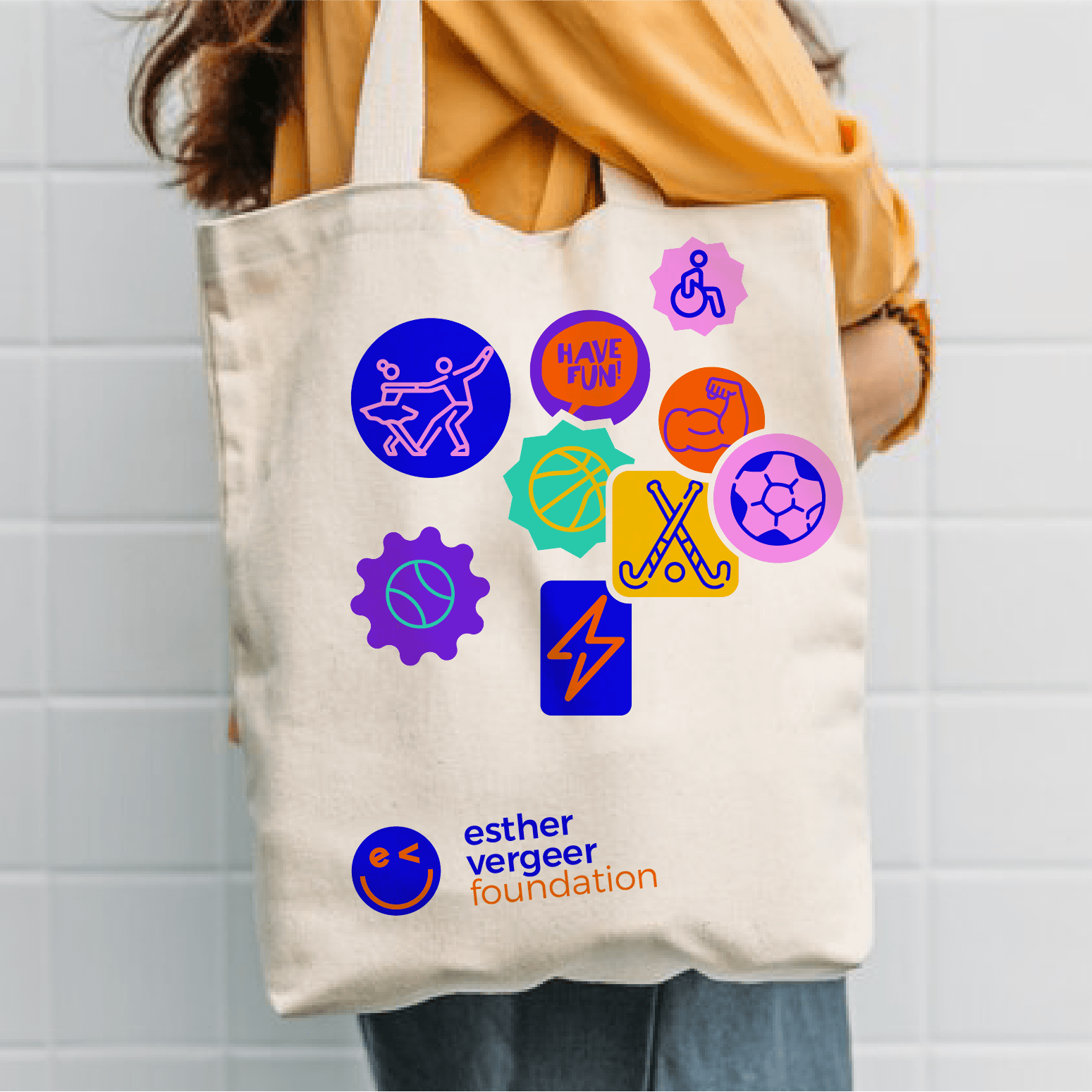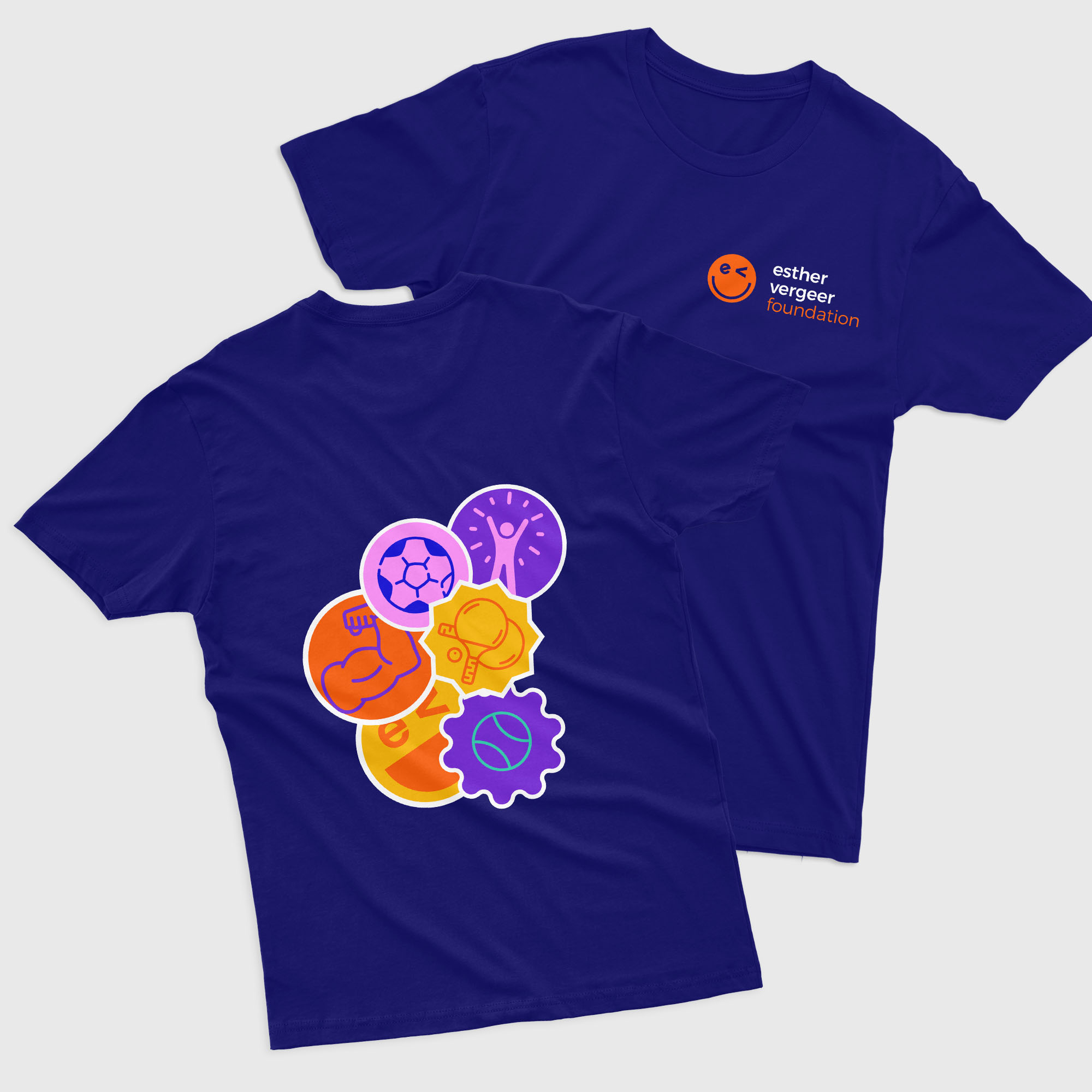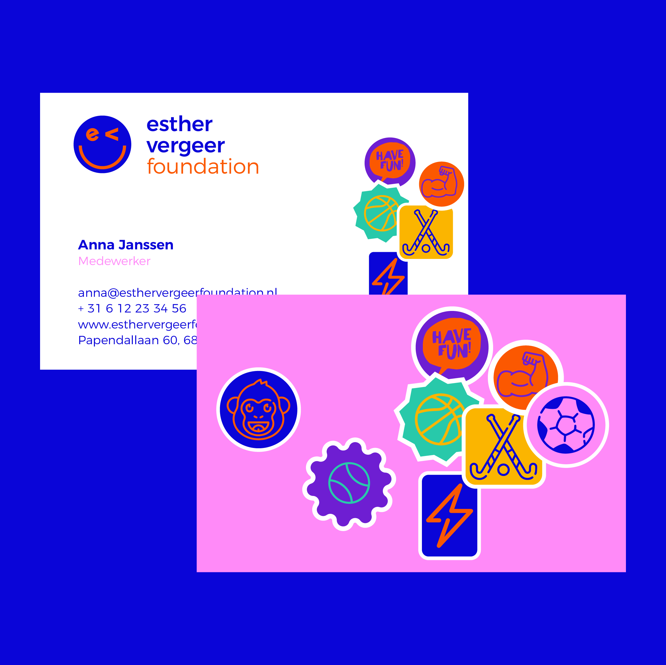 De initialen van Esther Vergeer vormen samen een smiley. Diep Arnhem animeerde niet alleen het 2D-logo, maar creëerde ook een reeks emoji’s in de vorm van vrolijke, kleurrijke stickers die sporten en emoties verbeelden die passen bij de doelgroep (kinderen) en de kracht van sport. De stickers worden speels en vrij toegepast in en rondom uitingen. Zo laat de Foundation zich zien als een dynamisch merk, altijd in beweging.
